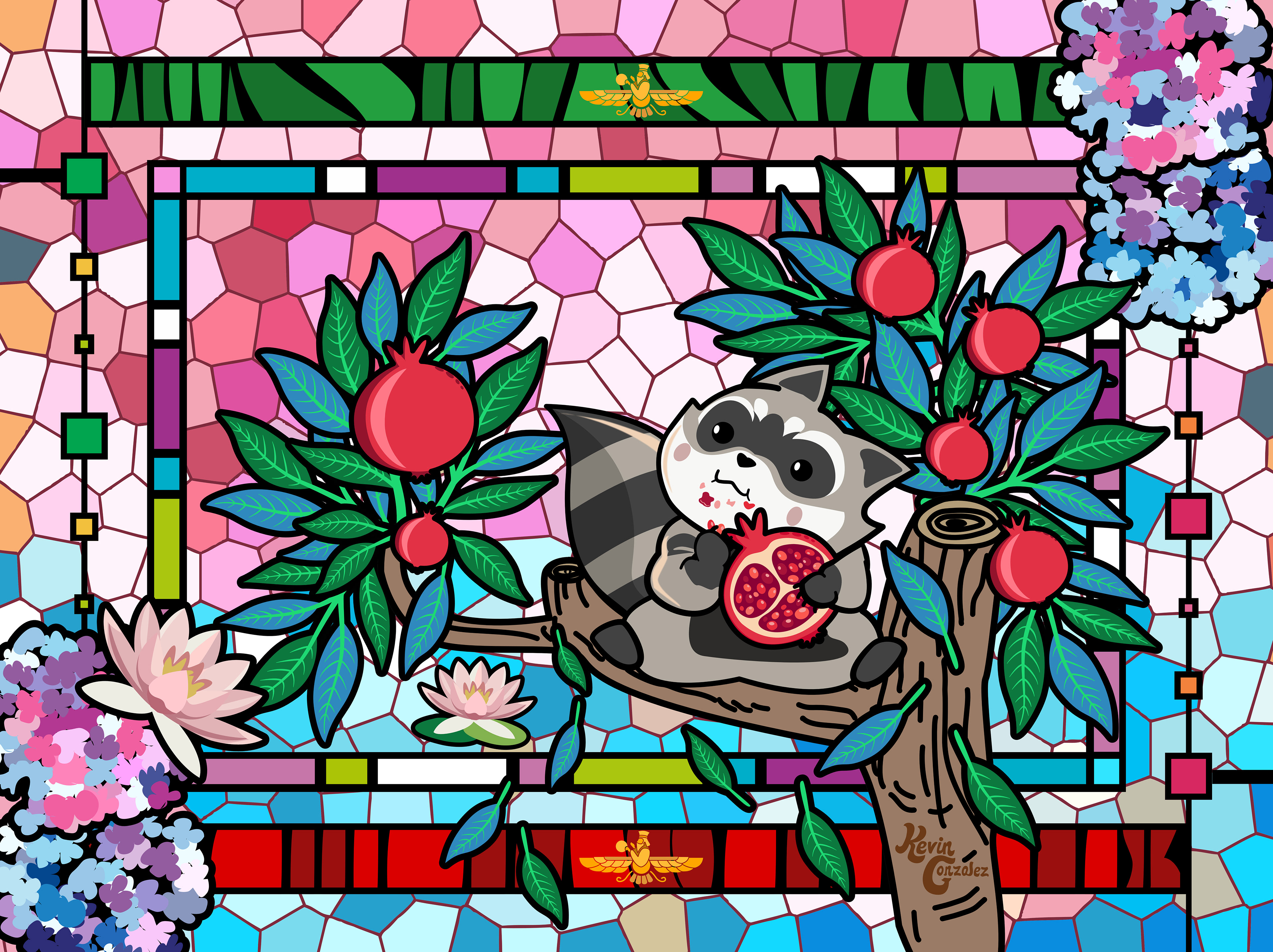 Stained Glass Persian Raccoon with Pomegranates